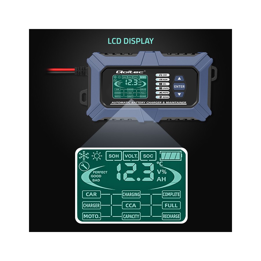 Polnilnik znamke Qoltec je mikroprocesorski polnilnik za natančno polnjenje , ki ponuja 6 načinov delovanja , kar znatno poenostavi postopek polnjenja. En polnilnik zadostuje za različne vrste baterij in podpira: