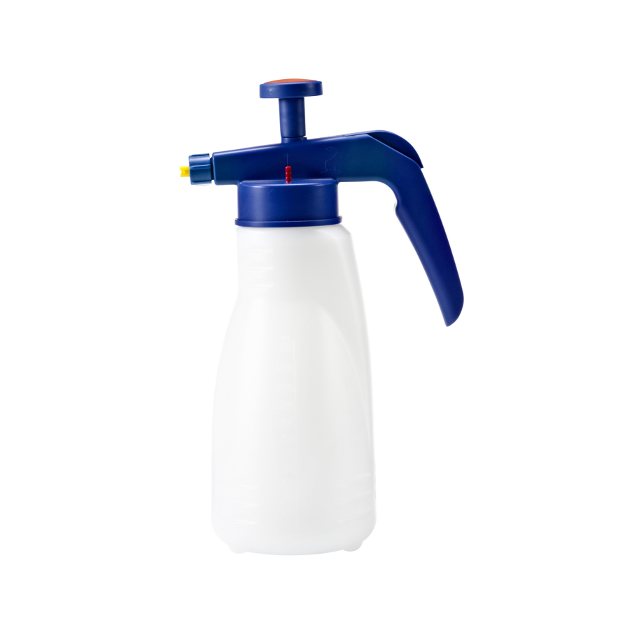• HDPE posoda z lestvico v ml. Glede na uporabo, vzorec pršenja in vrtljivost so na voljo naslednje šobe: nastavljiva in vrtljiva šoba, medenina + ravna pršilna šoba 110°